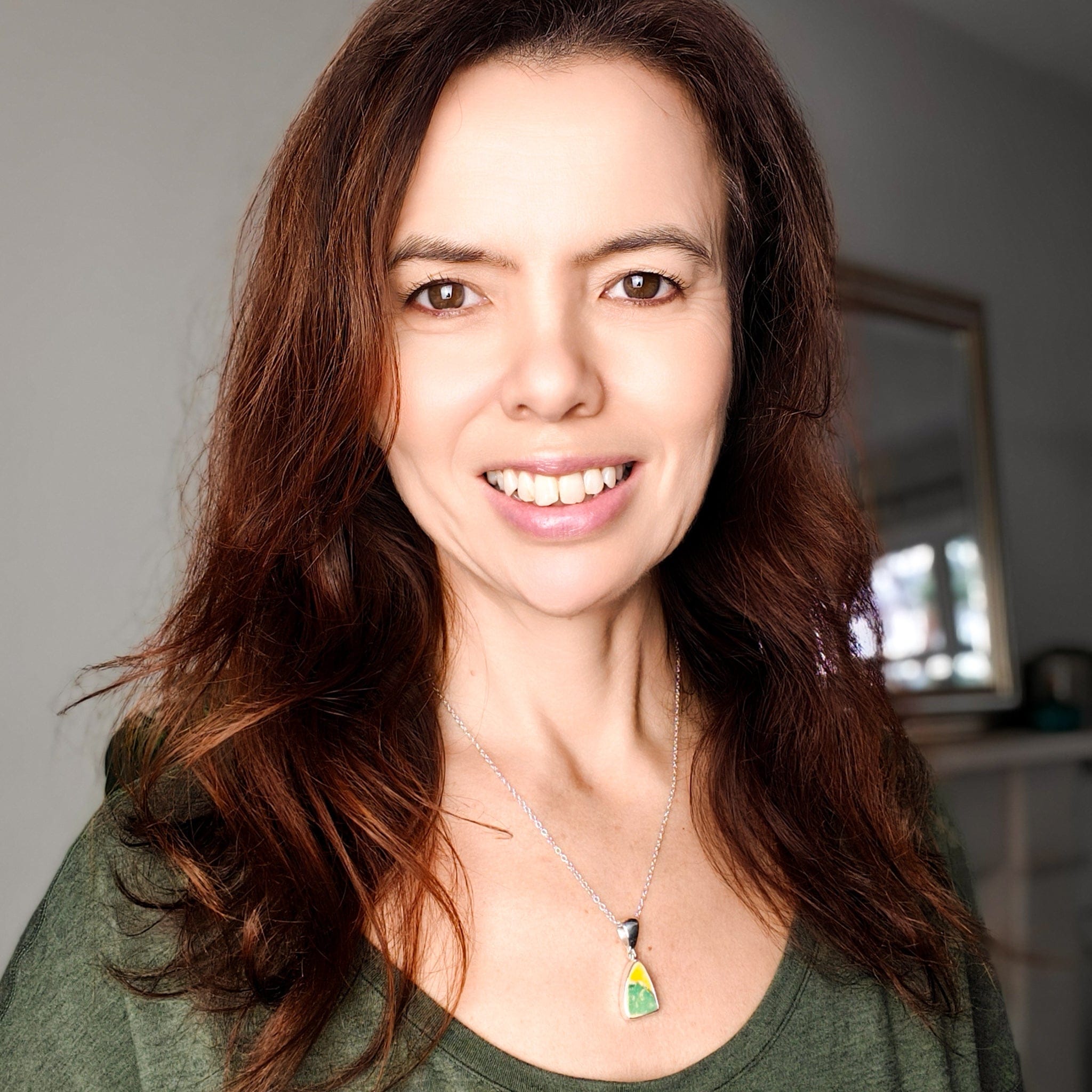This handcrafted necklace features an abstract fragment of original 1930s Clarice Cliff pottery. This specific piece showcases the 'Bizarre' motif, characterised by its bold colour palette, incorporating green, yellow and brown.