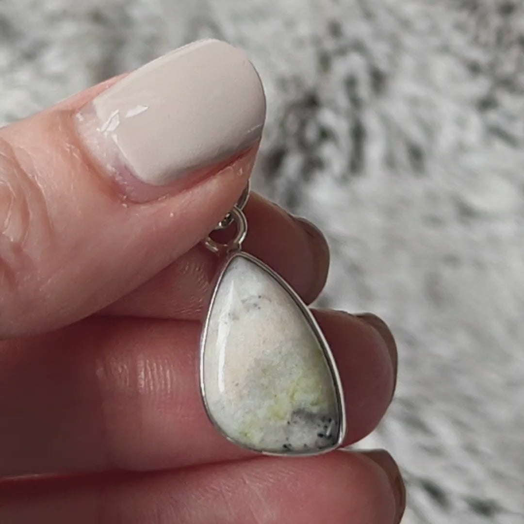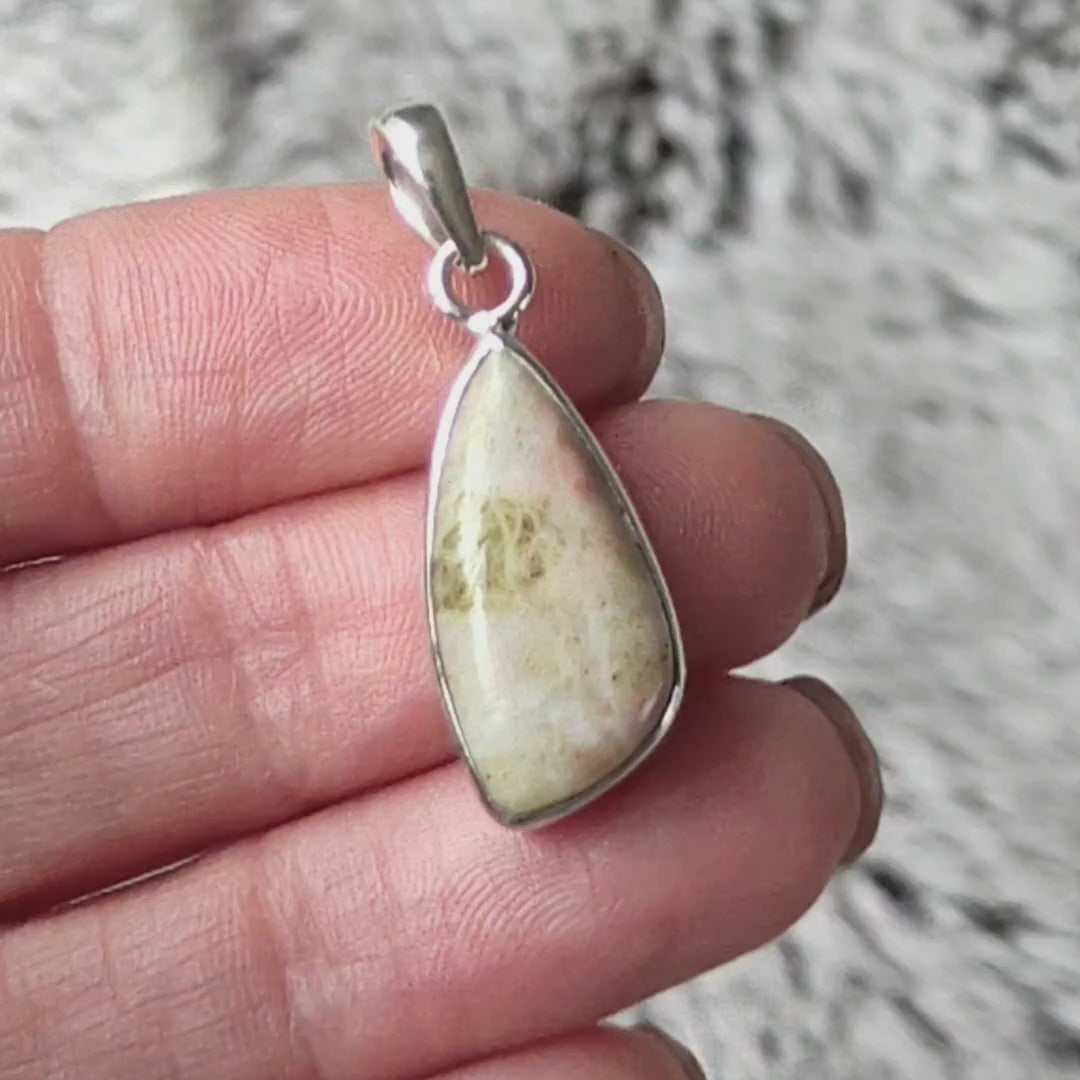 A stunning Isle of Skye Marble pendant, featuring a dainty mottled pink green and grey stones with fascinating markings.
