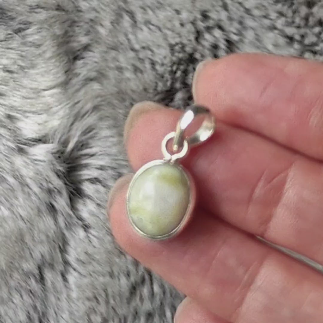 The oval-shaped Scottish pendant features Isle of Skye marble expertly crafted and refined, elegantly encased in sterling silver with a solid silver back.
