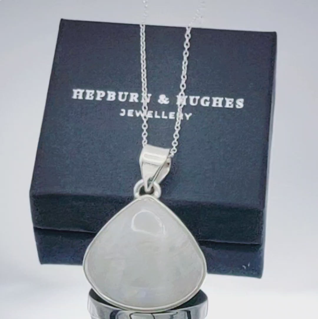 A classic teardrop shaped Rainbow Moonstone Pendant set in Sterling Silver. A new addition to our popular Moonstone gemstone collection - they make great gifts for those with June birthdays or couples celebrating a 3rd wedding anniversary.