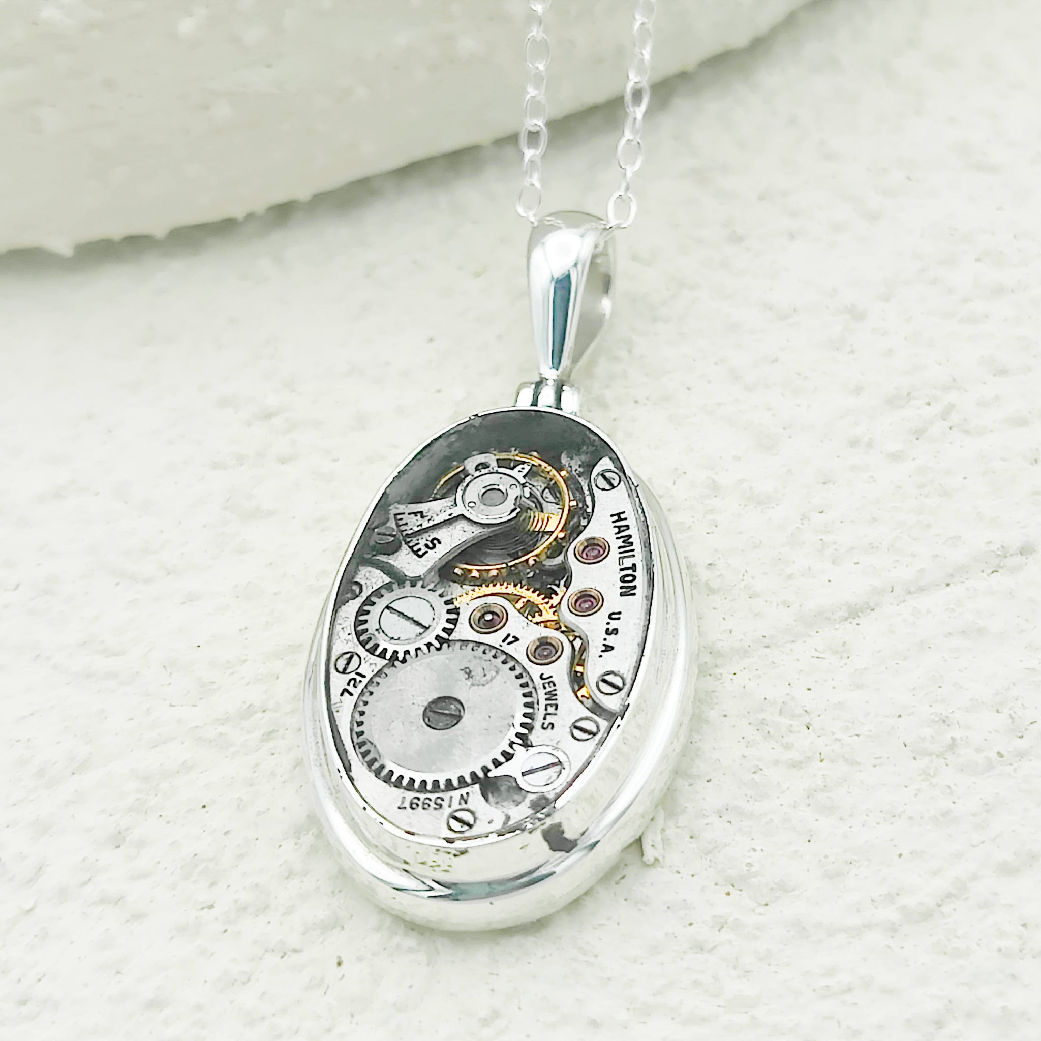 A beautiful timepiece pendant made using a Vintage watch movement. Choose from a Hamilton, Wittnauer or Waltham watch movement, manufactured in the middle of the last century.
